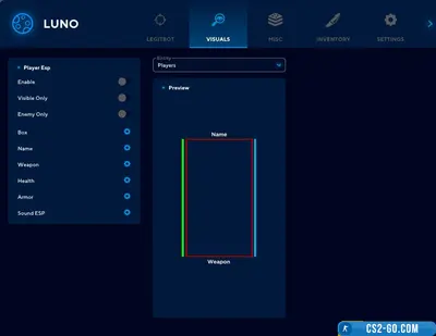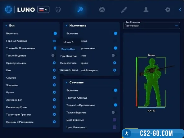 - The main functions of the Luno include automatic aiming, which helps to reduce reaction time and improve shooting efficiency. "WH" allows you to see enemies through walls, which makes it possible to assess their position in advance and prepare for an attack. "ESP" provides information about the location and condition of enemies, displaying their nicknames, health and weapons, which makes the battle even more predictable.