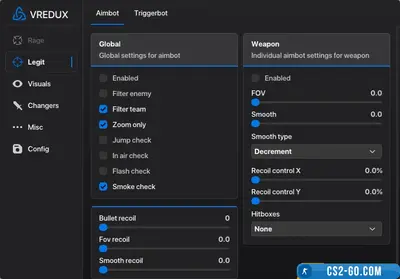 VRedux offers a full set of features for a comfortable and efficient game. First of all, it is a smart AIM assistant that provides accurate targeting of the enemy's vulnerable areas. You can adjust the strength and smoothness of aiming to suit your style of play, as well as select priority areas for attack. ESP and Wallhack allow you to see enemies through walls, track their health and weapons, which gives you a complete understanding of the situation on the map.