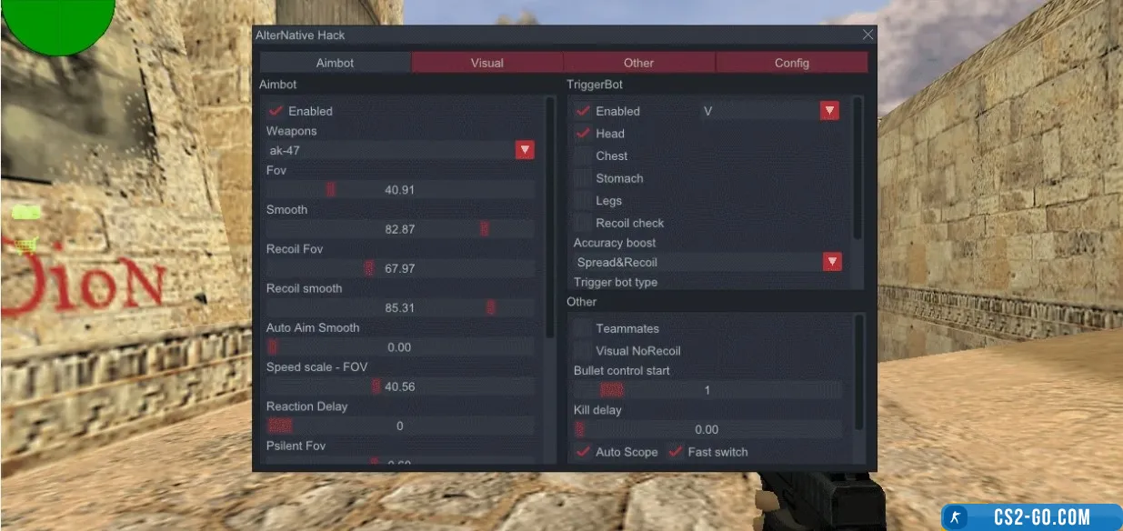 - The main feature of “Alternative Hack” is an aimbot that automatically aims at opponents, improving shooting accuracy and simplifying the attack process. Users can configure aimbot parameters such as sensitivity, aiming speed, and capture angle through the configuration file. This allows the aimbot functionality to be tailored to personal preferences and helps minimize the risk of detection.