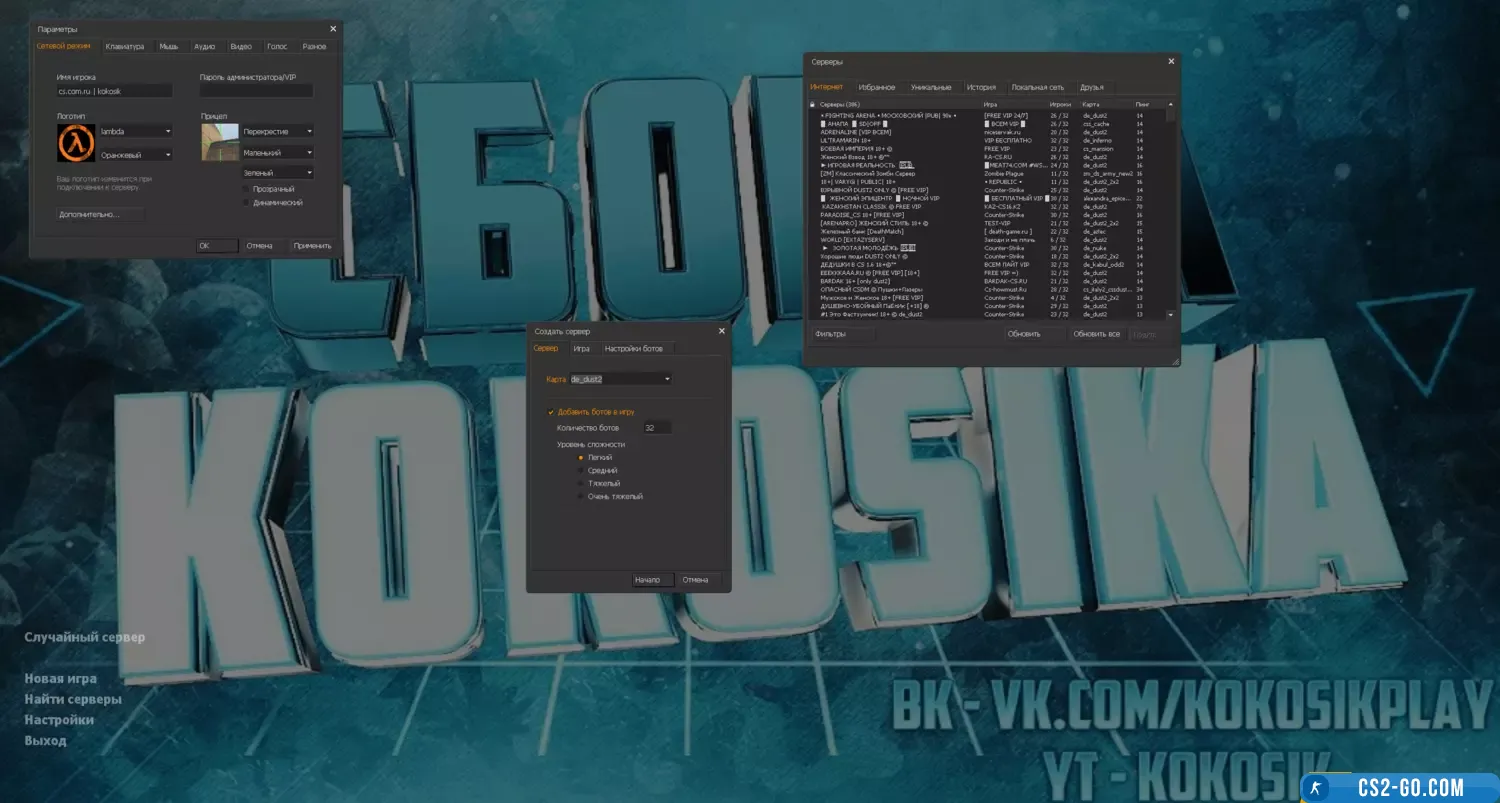 - In Kokosik’s build, you will find all the classic maps (de_dust2, de_inferno, cs_office, and others), standard game modes, and clean multiplayer without unnecessary modifications. An additional advantage is a convenient launcher with simple settings, allowing quick connection to your favorite servers.